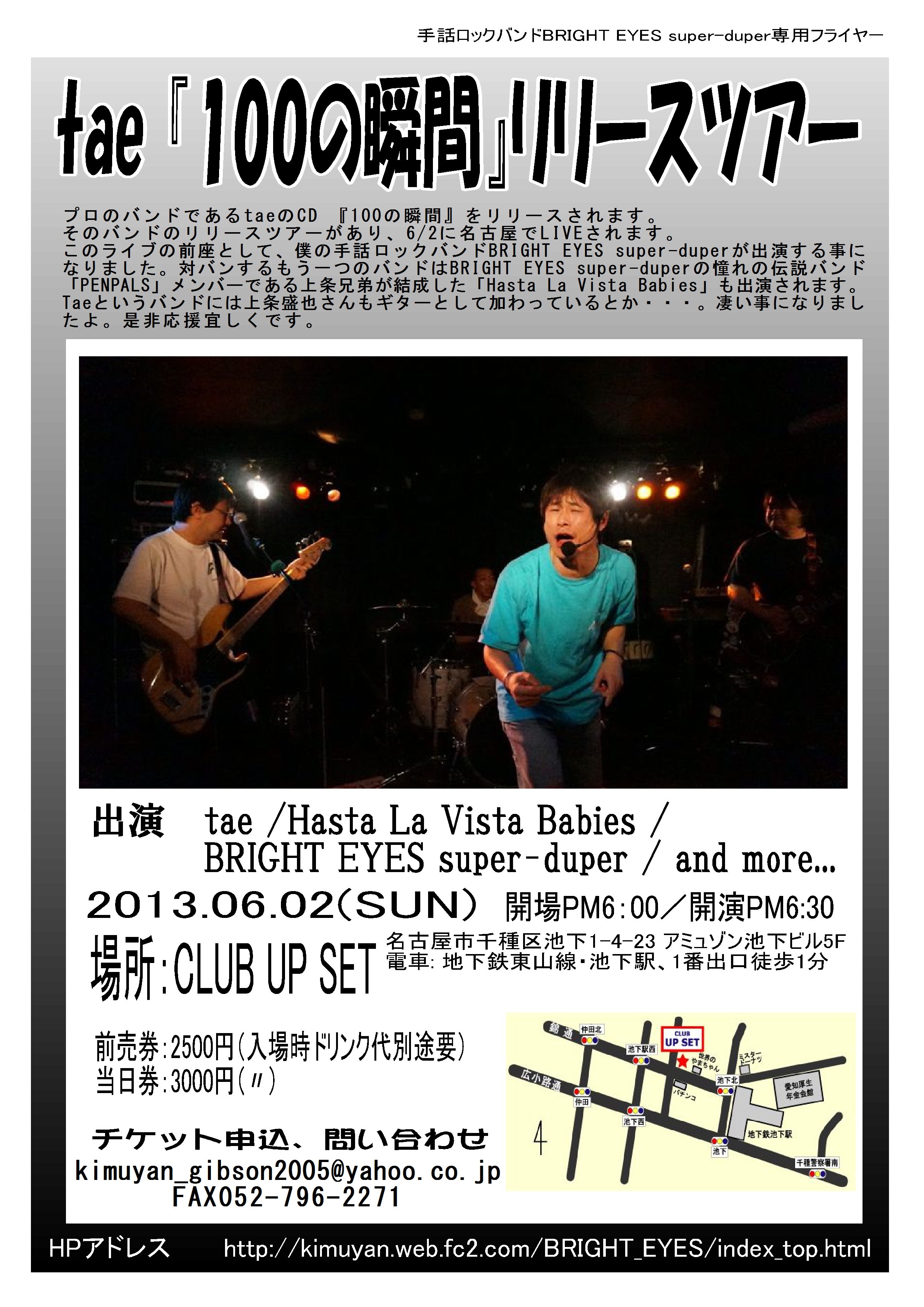プロのバンドであるtaeのCD 『100の瞬間』をリリースされます。 そのバンドのリリースツアーがあり、6/2に名古屋でLIVEされます。 このライブの前座として、僕の手話ロックバンドBRIGHT EYES super-duperが出演する事になりました。 対バンするもう一つのバンドはBRIGHT EYES super-duperの憧れの伝説バンド「PENPALS」メンバーである上条兄弟が結成した「Hasta La Vista Babies」も出演されます。 Taeというバンドには上条盛也さんもギターとして加わっているとか・・・。 凄い事になりましたよ。是非応援宜しくです。 ●日時:2013年6月2日(日) 開場17:30 開演18:00 ●会場:CLUB UP SET(名古屋市千種区池下1-4-23 アミュゾン池下ビル5F) http://www.club-upset.com/ ●出演:tae /Hasta La Vista Babies /BRIGHT EYES super-duper /and more... ●前売券:\2,500 /当日券\3,000 ※別途ドリンク代要 ●前売券予約は以下をクリックし、「taeツアーライブ前売券希望」「希望枚数」「名前」を記入の上、送信願います。 http://form1.fc2.com/form/?id=146379 ※FAXでの申し込みも、大歓迎します。FAX052-796-2271 .