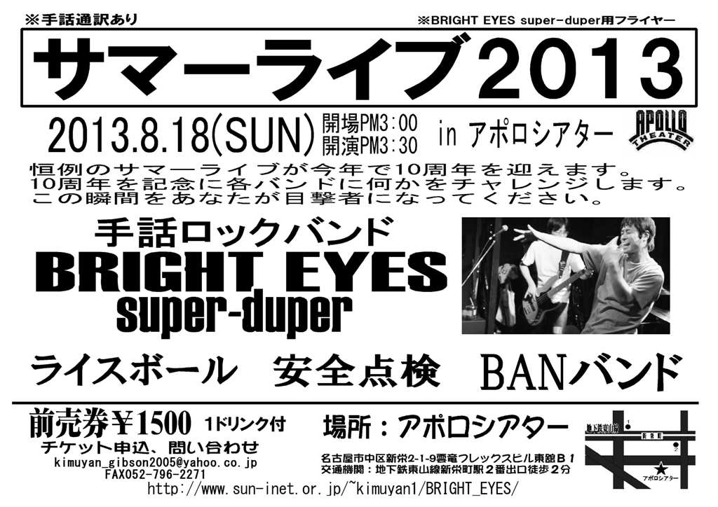 ●前売券予約は以下をクリックし、「サマーライブ前売券希望」「希望枚数」「名前」を記入の上、送信願います。 6/8に新潟県にて福祉のイベントがあり、手話ロックバンドBRIGHT EYES super-duperが演奏する事になりました。 新潟周辺に住んでる方は是非立ち寄り下さいませ。 新潟県上越市の福祉イベント「ふくしのひろば」 ○日時:平成25年6月8日(土)10:00~14:00 ○会場:リージョンプラザ上越インドアスタジアム(上越I.C近くに会場あり) 上越市下門前446-2 ○演奏:BRIGHT EYES super-duper出演時間は13:00~13:45 ○入場無料