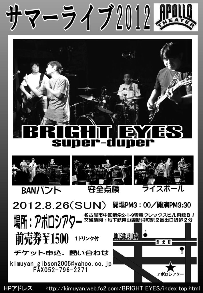 このライブの良いところは、早く行けば座れます。 立見が苦手な方には好都合なライブだと思います。 行きたい方は早目に予約願います。 -------- サマーライブ2012 ●日時:2012年8月26日(日)開場15:00開演15:30~ ●場所:アポロシアター 名古屋市中区新栄2-1-9雲竜フレックスビル東舘B1 TEL 052-261-5308 地図: http://seminken.boo.jp/rideon11/accesspage.html ●前売券:1500円(1ドリンク付) ●交通機関:地下鉄東山線新栄町駅2番出口徒歩2分 ●出演バンド:BRIGHT EYES super-duper、安全点検、BANバンド、ライスボール ※手話通訳あり。 以下のBRIGHT EYES super-duper問い合わせサイトに各項目を記入の上、内容に「サマーライブチケット予約希望枚数」を書き、送信願います。 http://form1.fc2.com/form/?id=146379