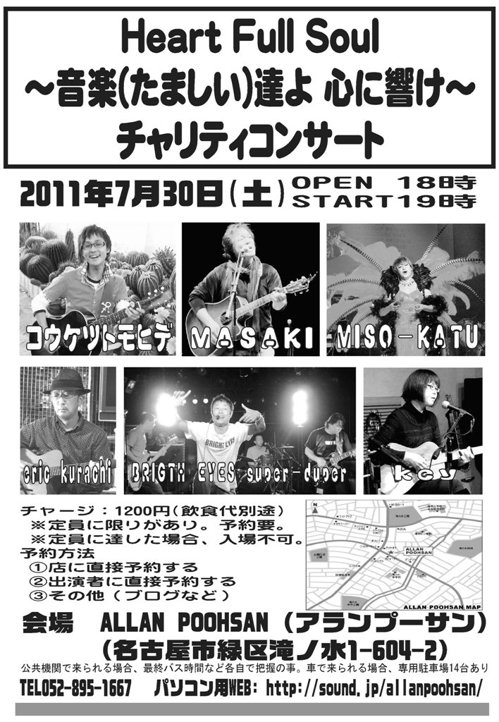 ★日時:2011年7月30日(土)OPEN18時、START19時~ ★場所:ALLAN POOHSAN(アランプーサン) 愛知県名古屋市緑区滝ノ水1-604-2 TEL052-895-1667 パソコン用WEB: http://sound.jp/allanpoohsan/ 地図: http://sound.jp/allanpoohsan/pooh_map2.gif ★チャージ:1200円(飲食代別途) ※定員に限りがあり。予約要。※定員に達した場合、入場不可。 ★予約方法:①店に直接予約する②出演者に直接予約する③その他(ブログなど) ★出演:コウケツトモヒデ、MASAKI、MISO-KATU、BRIGTH EYES super-duper、エリックkurachi、key ※公共機関で来られる場合、最終バス時間など各自で把握の事。車で来られる場合、専用駐車場14台あり。 |