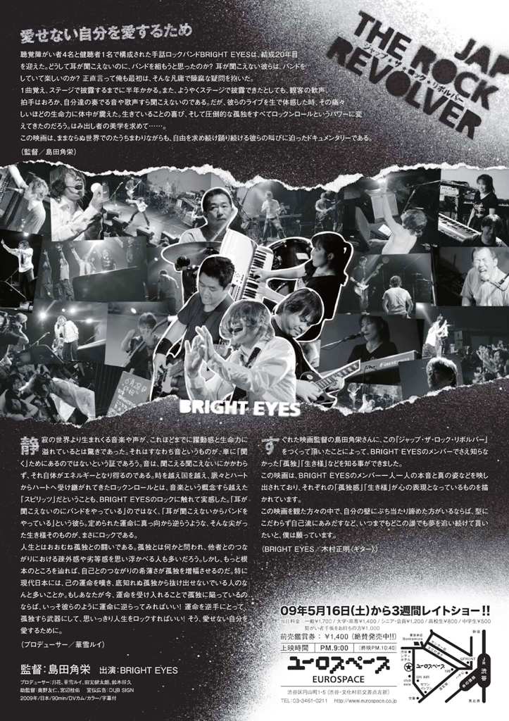 『ジャップ・ザ・ロック・リボルバー』名古屋上映決定!!! 2010年3月6日か14日のどちらかに新潟で開催される聴覚障がい者の方と健聴者の方に向けた映画祭「新潟しゅわる映画祭」に上映が内定しました。 音楽情報サイトえびてん!にて「ジャップ・ザ・ロック・リボルバー」の宣伝のご協力を頂きました。 今、公開中のブライトアイズのドキュメンタリー映画『ジャップ ザ ロックリボルバー』ですが、シネマスコーレの映写機の工事があり、3月19日の上映がお休みだそうです。 3/22(祝)の上映後、手話ロックバンドBRIGHT EYESのリーダーである木村正明さんとプロのミュージシャンであるシンガーソングラーター渡辺りえこさんのトークショーと、渡辺りえこさんのミニライブをする事になりました。(会場の都合上、ブライトアイズのバンド演奏はありません) 2010年10月08日にオランダのハーグにある「 MuteSounds」イベントにBRIGHT EYES映画化「ジャップ・ザ・ロック・リボルバー」が上映されました。 2010年11月5日に名古屋聾学校文化祭にて上映されました。 【上映日】2011年4月23日(土)・24日(日)