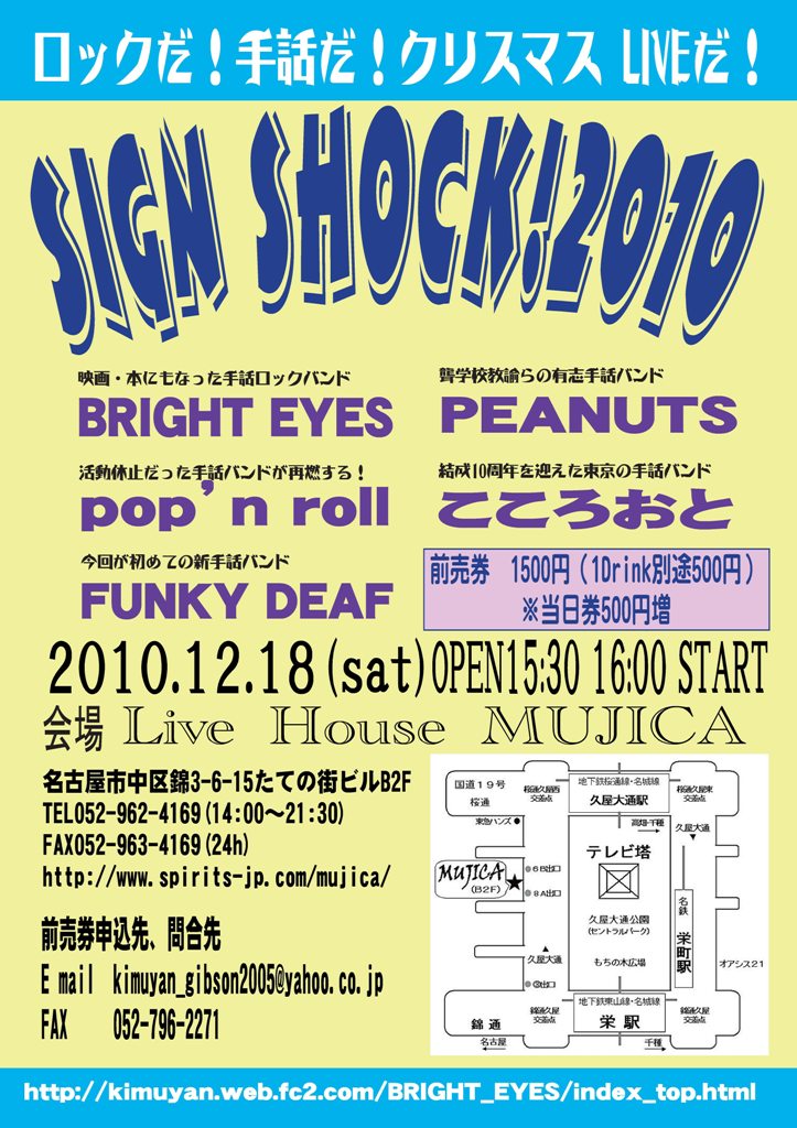 お待たせしました。毎年12月に名古屋にて手話バンドのライブを開催していますが、 今年もやる事になりました!そして今年は5バンド(うち1バンドは東京のバンド) も出演します。是非みなさんも一緒に盛り上がりましょう! ●日時:2010.12.18(土)OPEN15:30 START16:00 ●場所:Live House MUJICA 〒460-0003 愛知県名古屋市中区錦3-6-15たての街ビルB2F アクセス・地図(HP)(モバイル) ●出演: 映画・本にもなった手話ロックバンド「BRIGHT EYES」 結成10周年を迎えた東京の手話バンド「こころおと」 聾学校教諭らの有志手話バンド「PEANUTS」 活動休止だった手話バンドが再燃する!「Pop'n Roll」 今回が初めての新手話バンド「FUNKY DEAF」 ●チケット:前売券¥1500、当日券¥2000 ※別途ドリンク代500円要 ※前売券完売の場合、当日券発行しません。 ●前売券予約は以下をクリックし、「SignShock!2010前売券希望」「希望枚数」「名前」を記入の上、送信願います。