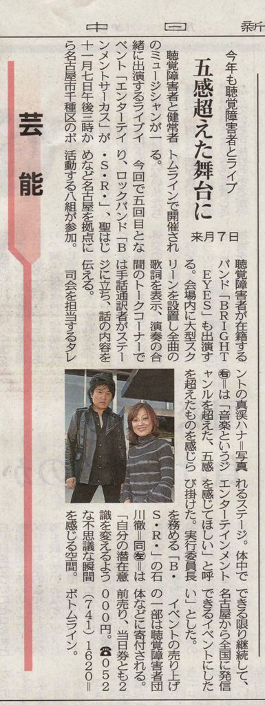 今年もチャリティライブイベント「エンターテイメントサーカス」があのイン ディーズバンドの夢のライブハウス”ボトムライン”で開催され、手話ロックバ ンドBRIGHT EYESもライブ出演する事になりました! 是非応援願います。 ■イベント主旨 (※実行委員会のコメントより抜粋) 障がい者と健常者のアーティストが一緒になって繰り広げる音楽の祭典 『エンターテイメントサーカス』が、5周年を迎える。 出演は、今池の女を歌うロックバンド『B.S.R.』、手話ロックバンド 『BRIGHT EYES』、『和太鼓塵輝』『ViVi』『聖はじめ』のほか全8アー ティストが集結する。テレビで活躍の『真渓ハナ』もMCで登場するなど、 音楽のバリアフリーらしく華やかなステージを演出し、名古屋から全国へ発信する。 ●日時:2010年11月7日(日) OPEN14:30 START15:00 ●場所:ボトムライン(名古屋市千種区今池4丁目7-11) 地下鉄今池駅3番出口前 http://www.bottomline.co.jp/ ●チケット ¥2,000-(別途1ドリンク¥500) ※イベント売上の一部を、聴覚障がい団体・社会福祉団体等へ寄付させていただきます。 ●出演アーティスト B.S.R BRIGHT EYES 和太鼓塵輝 ViVi 聖はじめ 顔面ラブ 歌舞姫(まいひめ) Love A cherry 【MC】Kazz/【Special MC】真渓ハナ ●主催 エンターテイメントサーカス実行委員会 ●協力 手話通訳ボランティア「龍の手・手話サークル」 ●問い合わせ 以下のサイトに「エンターテイメントサーカス問い合わせ」と問い合わせ 内容を記入の上、送信願います。 http://form1.fc2.com/form/?id=146379 ●チケット申し込み 以下のサイトに「エンターテイメントサーカス前売券希望」「希望枚数」 「名前」を記入の上、送信して頂ければ予約取り置きします。 受付で名前を言って頂ければ前売券と引き換えます。 http://form1.fc2.com/form/?id=146379 ※FAXでの申し込み、問い合わせも、大歓迎します。 FAX052-796-2271 2010年10月20日中日新聞夕刊にエンターテイメントサーカスの記事が載りました。